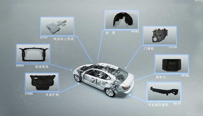 非金屬產(chǎn)品包括前端框架、車底護板、備胎倉、門基板、輪罩、電池包上殼體等